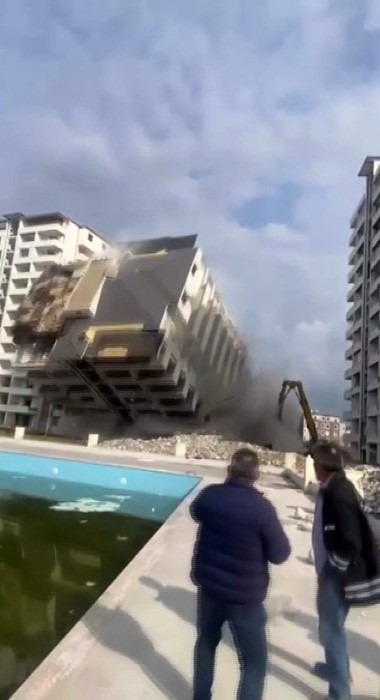 Hatay’ın İskenderun ilçesinde, Kahramanmaraş merkezli depremlerde hasar alan 13 katlı bina iş makinasının darbesiyle yerle bir oldu, yaşanan panik cep telefonu kamerasına yansıdı.