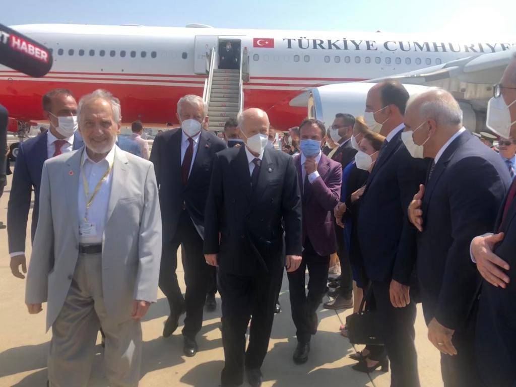 Cumhurbaşkanı Erdoğan'la birlikte KKTC'ye giden MHP Lideri Devlet Bahçeli ve Saadet Partisi Yüksek İstişare Kurulu Başkanı Oğuzhan Asiltürk uçaktan kol kola indi.