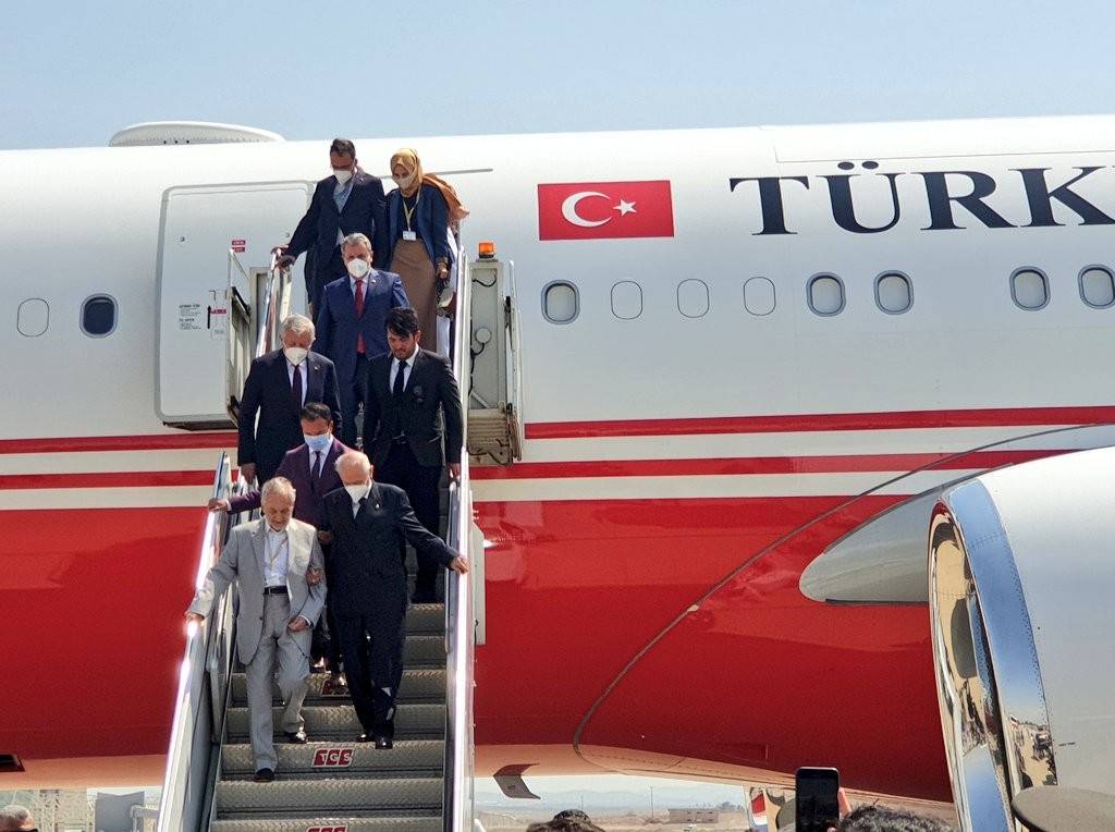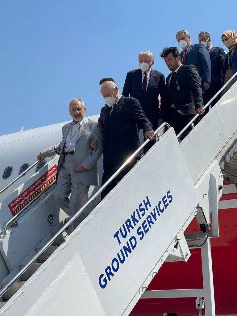 Bahçeli, uçaktan Saadet Partisi Yüksek İstişare Kurulu Başkanı Oğuzhan Asiltürk ile kol kola indi.