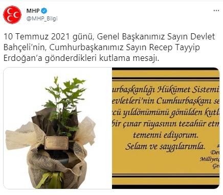 Bahçeli, fidanı, "Cumhurbaşkanlığı Hükümet Sistemi'nin ve Zat'ı Devletleri'nin Cumhurbaşkanı seçilişinin üçüncü yıl dönümünü gönülden kutluyor, yeni bir çınar rüyasının tezahür etmesini temenni ediyorum." mesajıyla Erdoğan'a gönderdi.