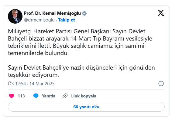 Milliyetçi Hareket Partisi (MHP) Genel Başkanı Devlet Bahçeli, Sağlık Bakanı Kemal Memişoğlu’nu telefonla arayarak 14 Mart Tıp Bayramı’nı kutladı.