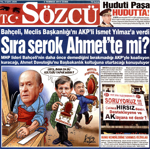 Bakıyorum da herkesin dilinde MHP var. Bu güzel bir gelişme. Demek ki 7 Haziran’da verilen milli emanet hakkıyla ve layıkıyla taşınıyor. Şahsım manşetlerden inmiyor. Bundan rahatsız değilim, sadece karikatürlerin üzerinde biraz daha çalışmak lazım; Sözcü dikkat etsin!