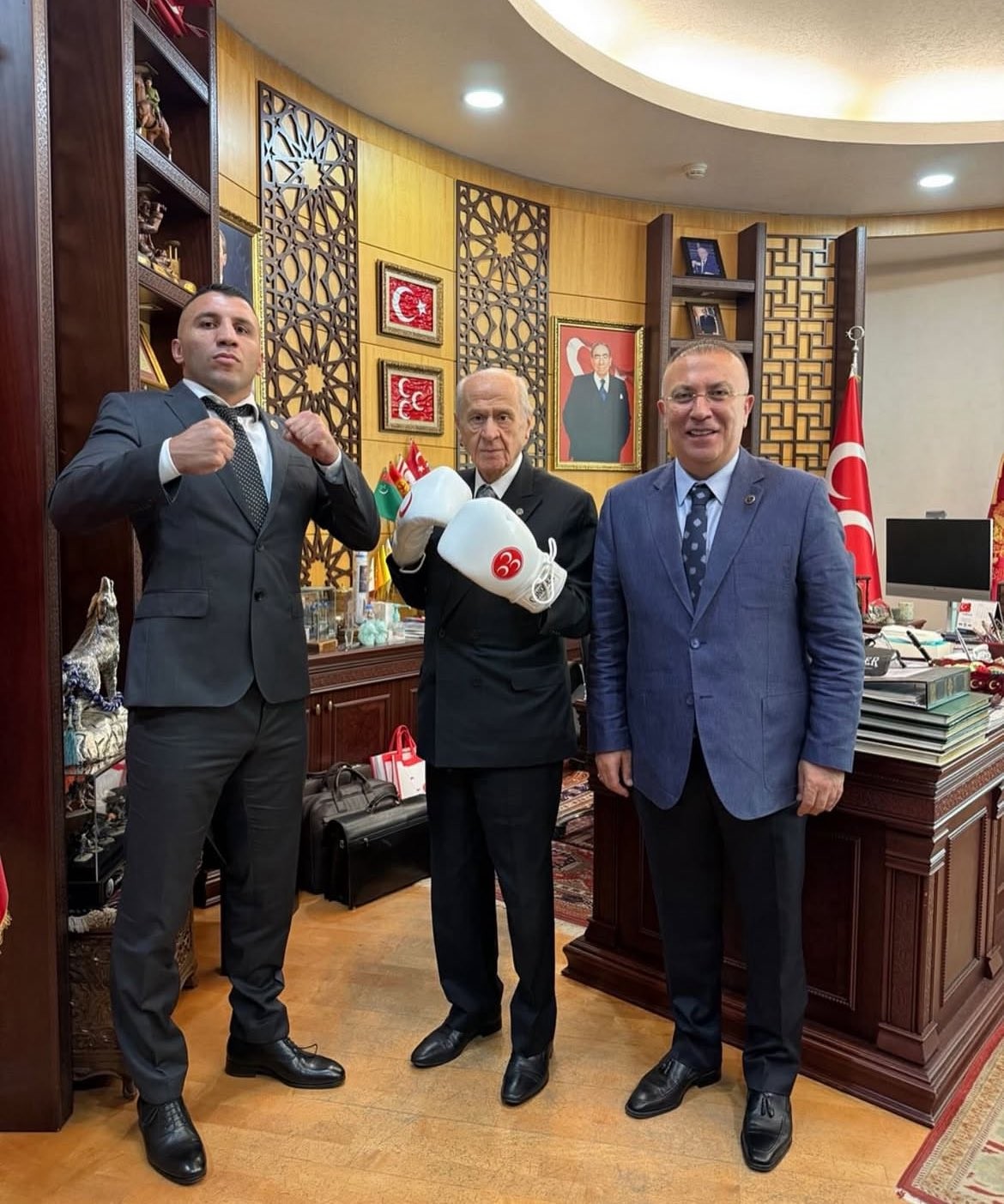 MHP Genel Başkanı Devlet Bahçeli, boksör Avni Yıldırım'ı makamında kabul ederken, Yıldırım ziyarette Bahçeli’ye üzerinde 3 hilal bulunan boks eldiveni hediye etti.