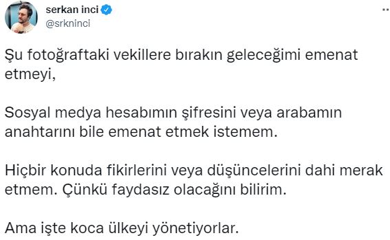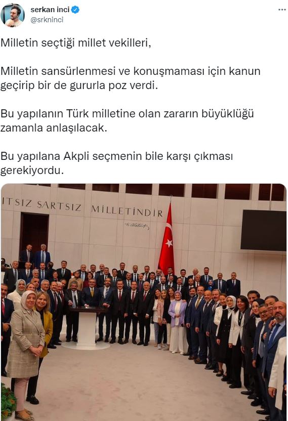 İnci paylaşımında, “Milletin seçtiği millet vekilleri, Milletin sansürlenmesi ve konuşmaması için kanun geçirip bir de gururla poz verdi. Bu yapılanın Türk milletine olan zararın büyüklüğü zamanla anlaşılacak. Bu yapılana Akpli seçmenin bile karşı çıkması gerekiyordu. Şu fotoğraftaki vekillere bırakın geleceğimi emenat etmeyi, Sosyal medya hesabımın şifresini veya arabamın anahtarını bile emenat etmek istemem. Hiçbir konuda fikirlerini veya düşüncelerini dahi merak etmem. Çünkü faydasız olacağını bilirim. Ama işte koca ülkeyi yönetiyorlar” dedi.