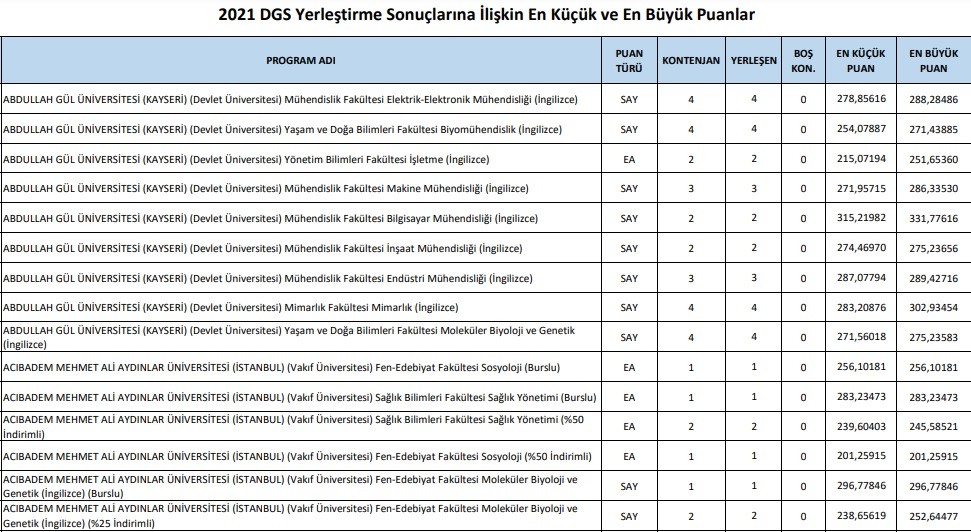 DGS 2022 taban puan başarı sıralaması kontenjanları