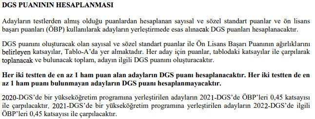 ÖSYM DGS'den kaç puan almak gerekir? Her iki testten de en az 0,5 ham puan alan adayların DGS puanı hesaplanacaktır. Her iki testten de en az 0,5 ham puanı bulunmayan adayların DGS puanı hesaplanmayacaktır. 2021 yılı ve müteakip yıllarda yapılacak olan DGS'de ise her iki testten de en az 1 ham puan alan adayların DGS puanı hesaplanacaktır.