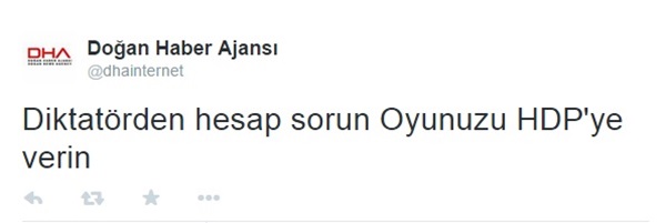 YENİAKİT.COM.TR - 7 Haziran seçimlerinde Doğan Haber Ajansı'nın (DHA) resmi Twitter hesabından, "Diktatörden hesap sorun. Oyunuzu HDP'ye verin" şeklinde skandal bir tweet atılmıştı. Ajans, daha sonrasında hacklendiğini iddia etmiş, bu iddia kendi takipçileri tarafından da inandırıcı bulunmamıştı.