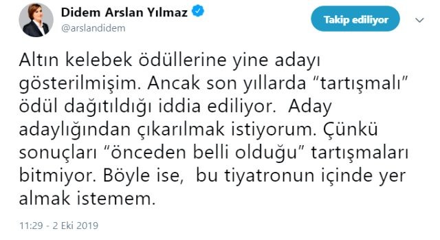 Didem Arslan Yılmaz'ın konuyla ilgili, "Altın kelebek ödüllerine yine adayı gösterilmişim. Ancak son yıllarda 'tartışmalı' ödül dağıtıldığı iddia ediliyor. Aday adaylığından çıkarılmak istiyorum. Çünkü sonuçları 'önceden belli olduğu' tartışmaları bitmiyor. Böyle ise, bu tiyatronun içinde yer almak istemem." ifadelerini kullandı.