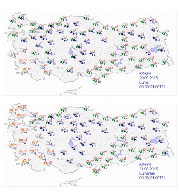 21 Mart Cumartesi: Marmara ve Ege parçalı bulutlu, İç Anadolu ve Doğu Anadolu kağ yağışlı, diğer bölgeler yağmurlu geçecek.