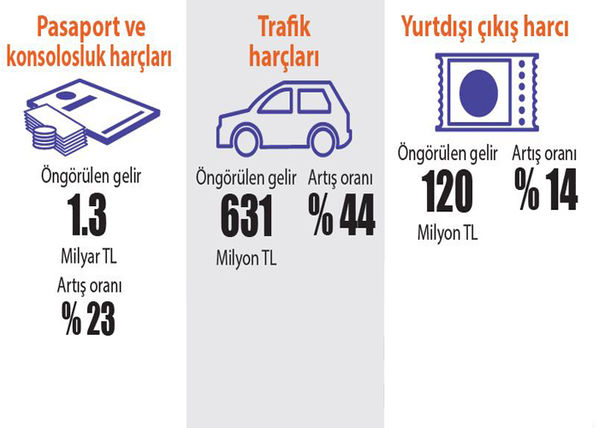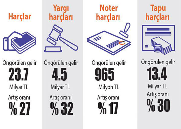 Ekonomik büyümeyi desteklemek amacıyla bu yıl nisan-eylül arasındaki dönemde tapu harçlarında dörtte bir oranında indirim yapıldı. Bunun baz etkisi dolayısıyla tapu harçlarından beklenen gelir hedefi yüzde 30 oranında artırıldı. Bu yıl 10.3 milyar lira beklenen tapu harçlarından, gelecek yıl 13.4 milyar lira gelir öngörülüyor. Pasaport ve konsolosluk harçlarından beklenen gelir ise yüzde 23 artışla 1.3 milyar lira olacak. Pasaport ve konsolosluk harçlarından 2017’de 1 milyar 46 milyon lira gelir bekleniyor. Bu yıl 824 milyon lira öngörülen noter harçlarından gelecek yıl beklenen gelir hedefi yüzde 17 artırılarak 965 milyon liraya çıkarıldı. Bu yılın 9 aylık gerçekleşmelerine göre 2017’de 105 milyon lira beklenen yurtdışı çıkış harçlarından gelecek yıl yüzde 14 artışla 120 milyon lira gelir öngörülüyor.