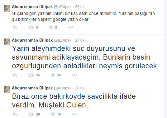 Konuyla ilgili olarak Twitter üzerinden açıklama yapan Dilipak, "Biraz önce Bakırköy’de Savcılıkta ifade verdim. Müşteki Gülen.. Yarın aleyhimdeki suç duyurusunu ve savunmamı açıklayacağım. Bunların basın özgürlüğünden anladıkları neymiş görülecek Suçlandığım yazının linkini bir kaç saat önce atmıştım. Yazının başlığı "ah şu bizimkilerin işleri" google yazın çıkar" dedi.