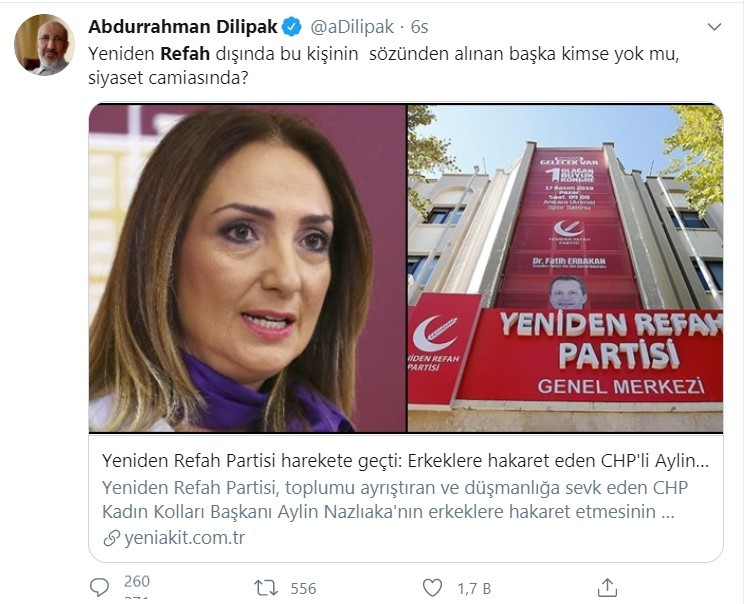 Toplumu kin ve düşmanlığa sevk eden, toplumun yarısına hakaret eden CHP Kadın Kolları Başkanı Aylin Nazlıaka için Yeniden Refah Partisi harekete geçti. Gazeteci Yazar Abdurrahman Dilipak ise "Yeniden Refah dışında bu kişinin sözünden alınan başka kimse yok mu, siyaset camiasında?" diye sordu.