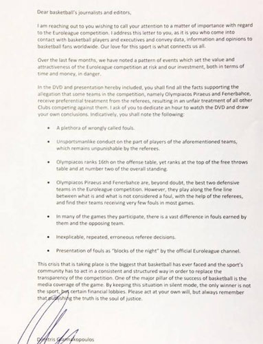 Fenerbahçe Doğuş ile oynadıkları maçın ardından Türkiye'ye yönelik sert ifadeler kullanıp 5 aylık ceza alan Panathinaikos Başkanı Dimitris Giannakopoulos yine sahneye çıktı. Dimitris Giannakopoulos, Euroleague'de Olympiakos ve Fenerbahçe Doğuş'un korunduğunu iddia ederken, basın mensuplarına bir DVD ve dosya gönderdi. Basın mensuplarına gönderilen dosyada maç görüntüleri, istatistikler ve kısa bir mektup yer alırken çarpıcı ifadeler yer aldı. Giannakopoulos'un mektubunda Fenerbahçe Doğuş ile ilgili ''Olympiacos ve Fenerbahçe Doğuş, Euroleague'de defansif olarak en iyi iki takım ancak bazı maçlarda hakemlerin yardımıyla onlara çok az faul çalındığı da bir gerek. Oynadıkları birçok maçta, rakip takım ve bu takımların aldığı faul sayılarında ciddi bir fark var'' ifadeleri de yer aldı. Giannakopoulos ayrıca gönderdiği DVD ile ilgili ''Size sunduğum DVD ve sunumda, EuroLeague hakemlerinin özellikle Olympiacos ve Fenerbahçe'ye karşı farklı bir tutum içerisinde olduğunu göreceksiniz'' ifadelerini de kullandı.