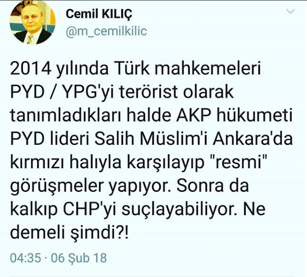 Siyasi paylaşımlarda bulunmaktan da çekinmeyen ‘öğretmen’ Cemil Kılıç, “Şehidin tabutuna yaslanıp konuşma yapan Cumhurbaşkanını eleştirdiğim demeç bugün Aydınlık gazetesinde yayınlandı.” deniliyor. Cumhurbaşkanı Erdoğan’ı hedef alan Kılıç, “Hedefimiz 3,5 milyon Suriyeliyi kendi topraklarına göndermek diye açıklama yapan Sn. Cumhurbaşkanı, benzer açıklamaları yapanları daha evvel mülteci düşmanı olmakla, Esadçı olmakla suçlamıştınız. Hayırdır inşallah!” diyor. Kılıç’ın AK Parti’yi eleştirdiği 6 Şubat 2018 tarihli paylaşımı şöyle: “2014 yılında Türk mahkemeleri PYD/YPG’yi terörist olarak tanımladıkları halde AKP hükumeti PYD lideri Salih Müslim’i Ankara’da kırmızı halıyla karşılayıp ‘resmi’ görüşmeler yapıyor. Sonra da kalkıp CHP’yi suçlayabiliyor. Ne demeli şimdi?!”