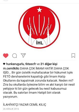 İstanbul’un Eyüpsultan ilçesindeki Rami Atatürk Anadolu Lisesi’nde Din Kültürü ve Ahlak Bilgisi öğretmenliği görevinde bulunan Mustafa Cemil Kılıç’ın sosyal medya paylaşımları, zehirli fikir dünyasını ele veriyor. Lise talebelerine Yüce İslâm dinini öğretmesi için memurluk vazifesinde bulunan Cemil Kılıç’ın İslam ve Müslüman karşıtı söylemleri tepki topluyor. Sosyal medyada “twitter.com/m_cemilkilic”, “instagram.com/m.cemilkilic” adresleri üzerinden paylaşımlarını yapan Kılıç’ın 26 Aralık 2016’da İmam Hatipler ile terör örgütü DEAŞ’ı özdeştirdiği görülüyor. Kılıç, “Daha çok İmam Hatip daha