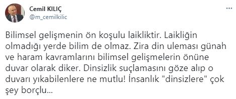 Sosyal medya hesabından, adeta bir ‘dinsiz’ gibi açıklamada bulunan Kılıç, alimleri hedef alırken bir yandan da ateizm propagandası yaptı.