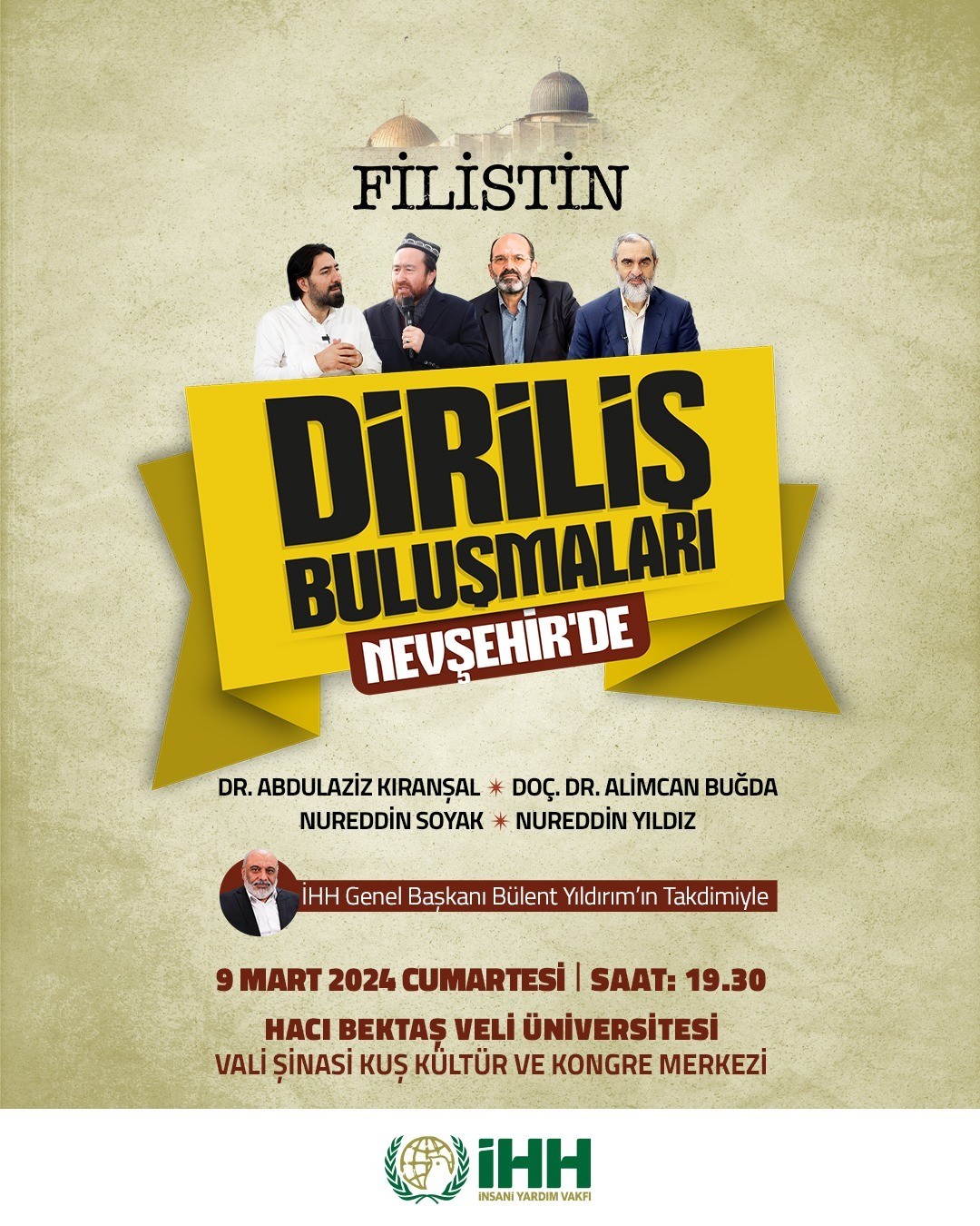 İHH İnsani Yardım Vakfı tarafından Filistin gündemiyle düzenlenen Diriliş Buluşmaları’nın 11’ncisi 9 Mart Cumartesi günü (yarın) Nevşehir’de gerçekleştirilecek.