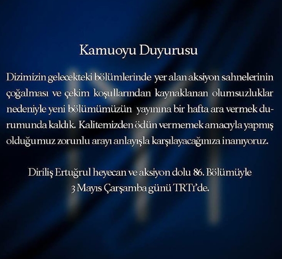 TRT 1'in efsane dizisi "Diriliş Ertuğrul"un 26 Nisan Çarşamba günü yayınlanması gereken 86'ncı bölümü, sahnelerin yetiştirilememesi nedeniyle 3 Mayıs'ta yayınlanacak. İzleyiciyi üzen haber dizinin resmi Instagram hesabından verildi.