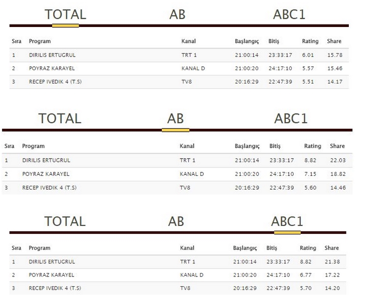Diriliş Ertuğrul dizisi Çarşamba günü yayınlanan bölümünde TOTAL'de, AB'de ve ABC1'de olmak üzere tüm reyting listelerinde birinci sıraya oturdu.