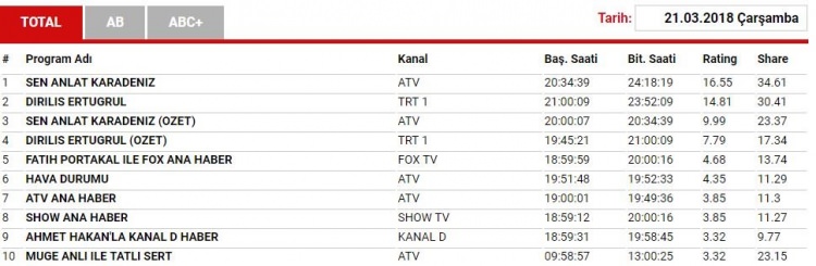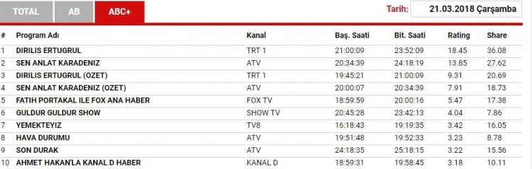 21 Mart Çarşamba reyting sonuçları açıklandı. Total grubunda yüzde 34.61 oranında izlenme payı elde eden Sen Anlat Karadeniz birinci oldu. Diriliş Ertuğrul ise AB ve ABC1 grubunda aldığı reytingler ile şaşırtmadı. Dizi, AB'de 37.69; ABC1'de ise yüzde 36.08 oranıyla ilk sıraya yerleşti.