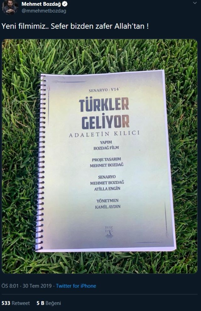 Diriliş dizisiyle büyük başarı elde eden ünlü yapımcı, 'Türkler Geliyor: Adaletin Kılıcı' filminin senaryosunu paylaşarak, "Yeni filmimiz... Sefer bizden zafer Allah'tan!" diyerek çekimlere start verdi.