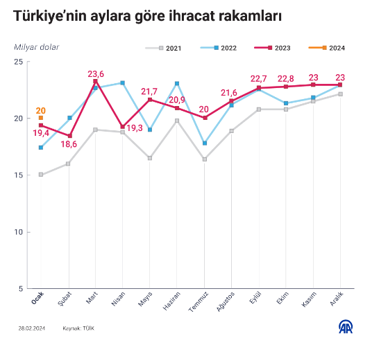 Türkiye'nin ihracatı ocakta geçen yılın aynı ayına göre yüzde 3,5 artarak 19 milyar 991 milyon dolar, ithalatı yüzde 22 azalarak 26 milyar 218 milyon dolar olarak gerçekleşti.