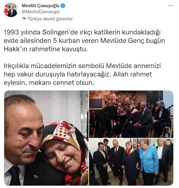 Çavuşoğlu paylaşımında, “1993 yılında Solingen’de ırkçı katillerin kundakladığı evde ailesinden 5 kurban veren Mevlüde Genç bugün Hakk’ın rahmetine kavuştu. Irkçılıkla mücadelemizin sembolü Mevlüde annemizi hep vakur duruşuyla hatırlayacağız. Allah rahmet eylesin, mekânı cennet olsun” dedi.