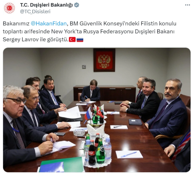 Bakanlığın X sosyal medya hesabından yapılan paylaşımda, Fidan'ın Rus mevkidaşı Lavrov ile ABD'nin New York kentinde bir araya geldiği belirtildi. Toplantıda ne konuştukları hakkında bir bilgi verilmedi.