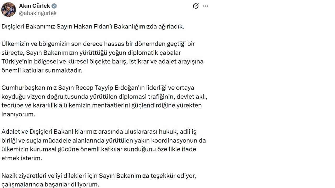 Adalet Bakanı Akın Gürlek, sanal medya hesabından yaptığı paylaşımda, Dışişleri Bakanı Hakan Fidan’ı bakanlıkta ağırladıklarını söyleyerek, "Ülkemizin ve bölgemizin son derece hassas bir dönemden geçtiği bir süreçte, Sayın Bakanımızın yürüttüğü yoğun diplomatik çabalar Türkiye’nin bölgesel ve küresel ölçekte barış, istikrar ve adalet arayışına önemli katkılar sunmaktadır.