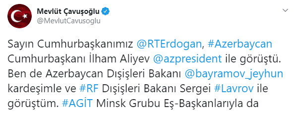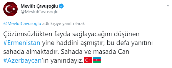 Cumhurbaşkanı Erdoğan’ın Azerbaycan Cumhurbaşkanı İlham Aliyev ile görüştüğünü kaydeden Çavuşoğlu, ‘Çözümsüzlükten fayda sağlayacağını düşünen Ermenistan yine haddini aşmıştır, bu defa yanıtını sahada almaktadır. Sahada ve masada Can Azerbaycan’ın yanındayız.” paylaşımında bulundu.