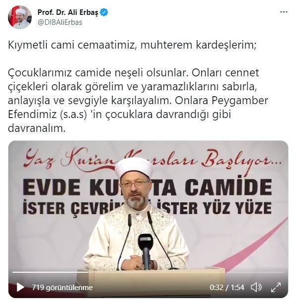 Diyanet İşleri Başkanı Ali Erbaş, yayınladığı mesajda, “Kıymetli cami cemaatimiz, muhterem kardeşlerim; Çocuklarımız camide neşeli olsunlar. Onları cennet çiçekleri olarak görelim ve yaramazlıklarını sabırla, anlayışla ve sevgiyle karşılayalım. Onlara Peygamber Efendimiz (s.a.s) 'in çocuklara davrandığı gibi davranalım” dedi.
