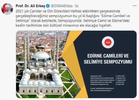 Diyanet İşleri Başkanı Ali Erbaş, Camiler ve Din Görevlileri Haftası’nda “Edirne Camileri ve Selimiye Sempozyumu” başlıklı ulusal düzeyde bir sempozyum düzenleyeceklerini duyurdu.