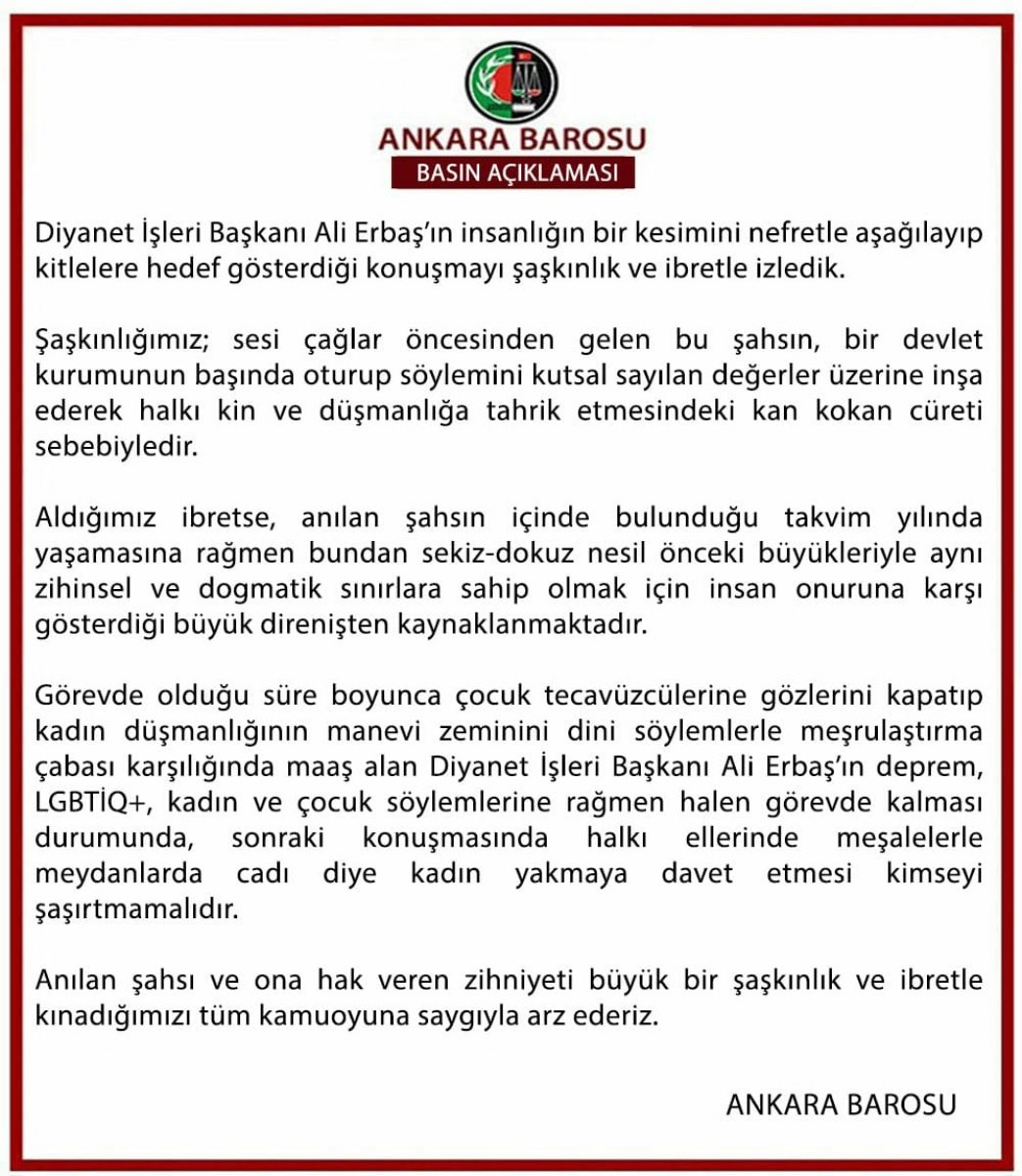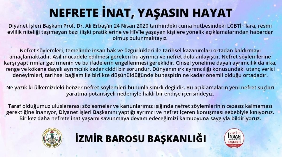 İHD, Ramazan ayının ilk hutbesinde Ali Erbaş'a eşcinsellere nefret söyleminde bulunduğu gerekçesiyle dava açarken, Ankara ve İzmir baroları da Erbaş'ı kınadı.