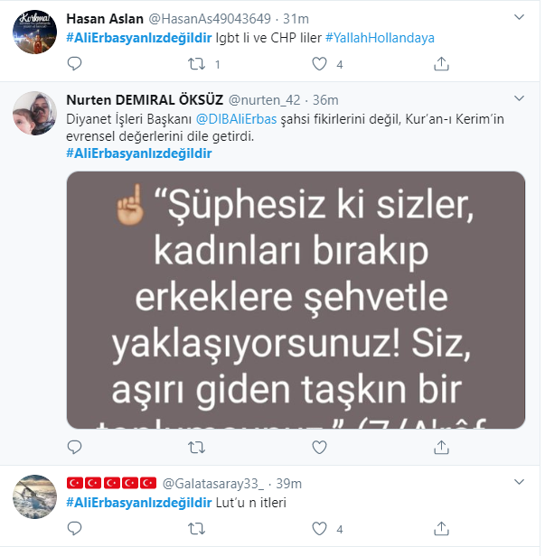 Diyanet İşleri Başkanı Ali Erbaş'ın eşcinseller ve sapkınlar hakkında söyledikleri birtakım çevreyi rahatsız etti. Erbaş'a saldıran güruha vatandaşlar sert tepki gösterdi. Erbaş'a sosyal medya üzerinden büyük destek verildi.