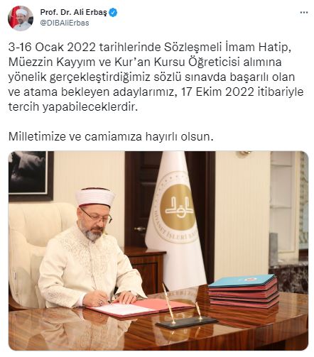 Diyanet İşleri Başkanı Prof. Dr. Ali Erbaş Sözleşmeli, “3-16 Ocak 2022 tarihlerinde Sözleşmeli İmam Hatip, Müezzin Kayyım ve Kur’an Kursu Öğreticisi alımına yönelik gerçekleştirdiğimiz sözlü sınavda başarılı olan ve atama bekleyen adaylarımız, 17 Ekim 2022 itibariyle tercih yapabileceklerdir. Milletimize ve camiamıza hayırlı olsun” dedi.