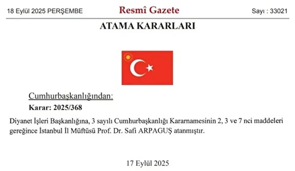 18 Eylül 2025 tarihli Resmi Gazete'de yayımlanan Atama Kararı'na göre; Diyanet İşleri Başkanlığına Prof. Dr. Ali Erbaş'ın yerine İstanbul Müftüsü Prof. Dr. Safi Arpaguş getirildi.