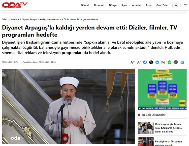 Oda TV, Diyanetin hutbesinden rahatsız olan medya organlarından biri ve okuyucularına haberi bu şekilde servis etti.