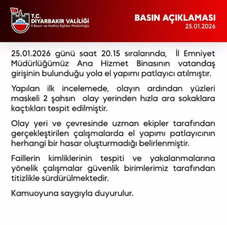 "25.01.2026 günü saat 20.15 sıralarında, İl Emniyet Müdürlüğümüz Ana Hizmet Binasının vatandaş girişinin bulunduğu yola el yapımı patlayıcı atılmıştır.