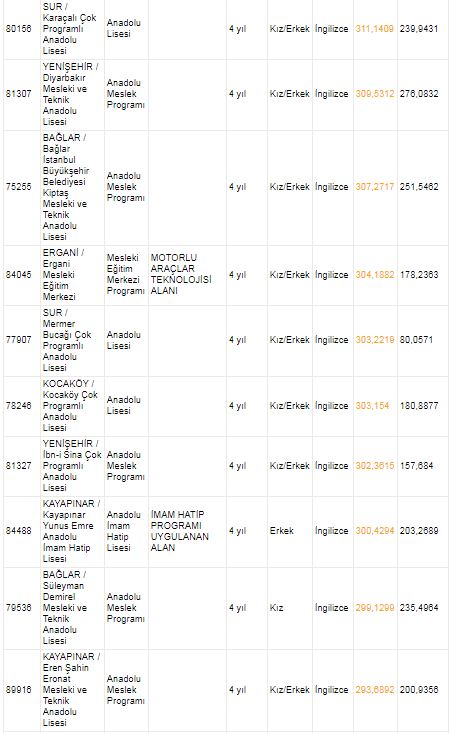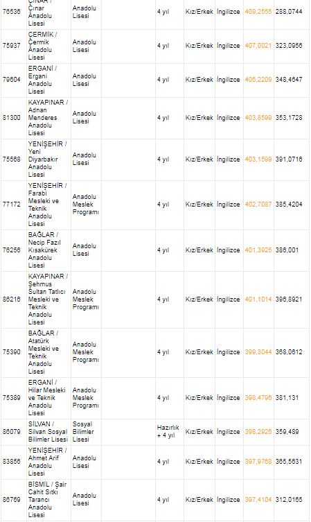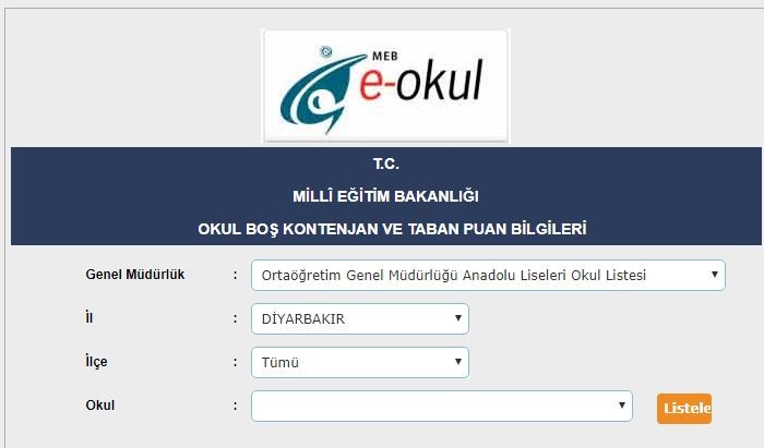 Diyarbakır lise taban puanları yüzdelik dilimleri kontenjanları MEB e okul vbs öğren