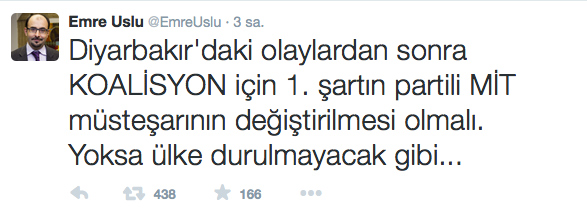 İlk açıklama Emre Uslu’dan geldi. Cemaat ve paralel yapı adına MİT’e savaş açan ve MİT TIR’larının durdurulması sürecinde Mehmet Baransu ile algı operasyonu yürüten Uslu, twitter’dan yaptığı açıklamada “Koalisyon için 1. Şartınpartili MİT müsteşarının değiştirilmesi olmalı” diyerek Hakan Fidan’ı hedef gösterdi.