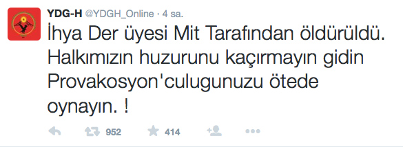 Emre Uslu’nun ardından PKK’nın ‘gençlik yapılanması’ adı altındaki şehir militanları da twitter’dan attıkları mesaj da MİT’I hedef aldı. YDGH hesabından “İhya Der üyesi MİT tarafından öldürüldü” diyerek olayın PKK ile alakası olmadığını öne sürdü.