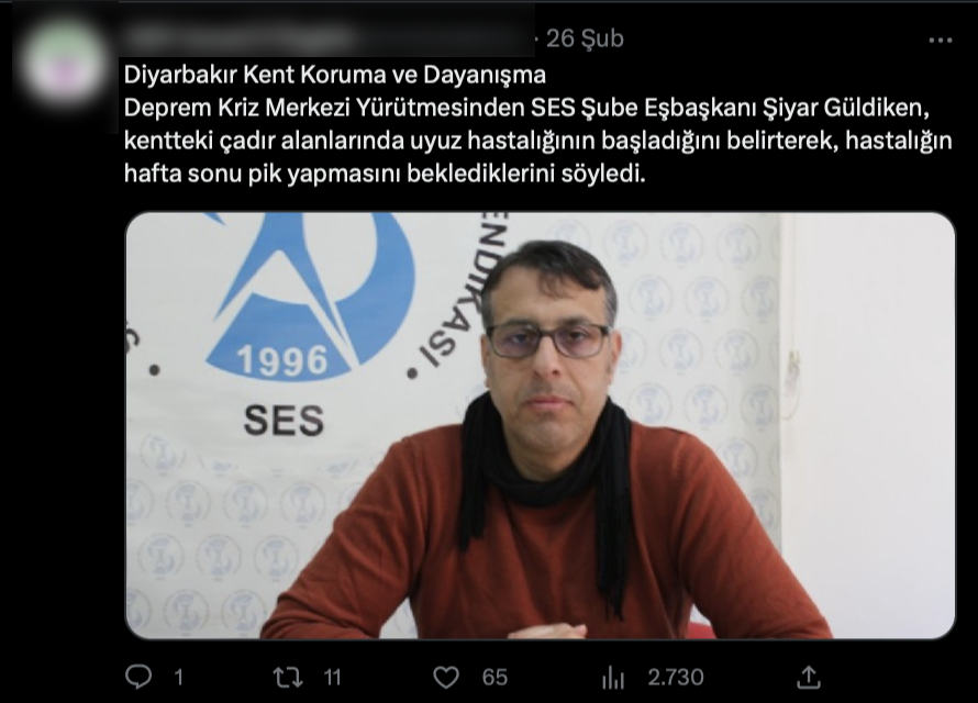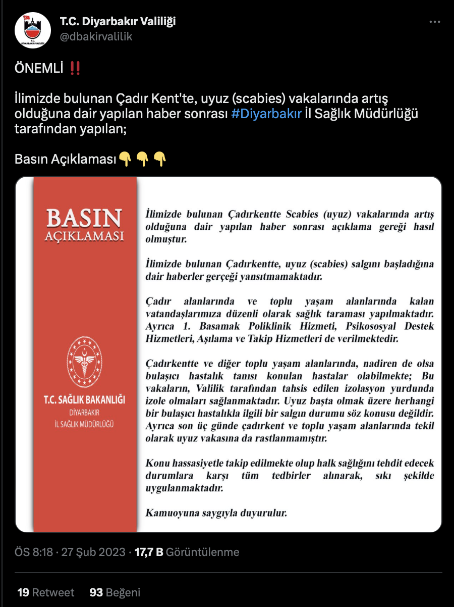 Diyarbakır Valiliği söz konusu iddialarla ilgili olarak, Diyarbakır İl Sağlık Müdürlüğü'nün konuyla ilgili yaptığı basın açıklamasını paylaştı. Açıklamada, Diyarbakır'da bulunan çadır kentte uyuz salgını başladığı iddialarının gerçeği yansıtmadığını, bölgede uyuz dahil olmak üzere herhangi bir salgın hastalık durumununa rastlanmadığı ve burada yaşayan kişilere düzenli olarak sağlık taraması yapıldığı belirtildi.