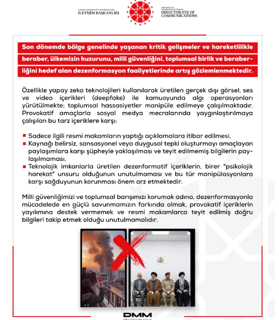 İletişim Başkanlığı Dezenformasyonla Mücadele Merkezi (DMM), son dönemde bölgedeki kritik gelişmelerle eş zamanlı olarak artış gösteren kirli bilgi trafiğine karşı vatandaşları uyardı. Özellikle yapay zeka (deepfake) teknolojileriyle üretilen sahte içeriklerin birer "psikolojik harekat" unsuru olduğuna dikkat çekilen açıklamada, "Milli güvenliğimizi hedef alan provokasyonlara karşı sağduyu ve resmi açıklamalar en büyük savunmamızdır" denildi.