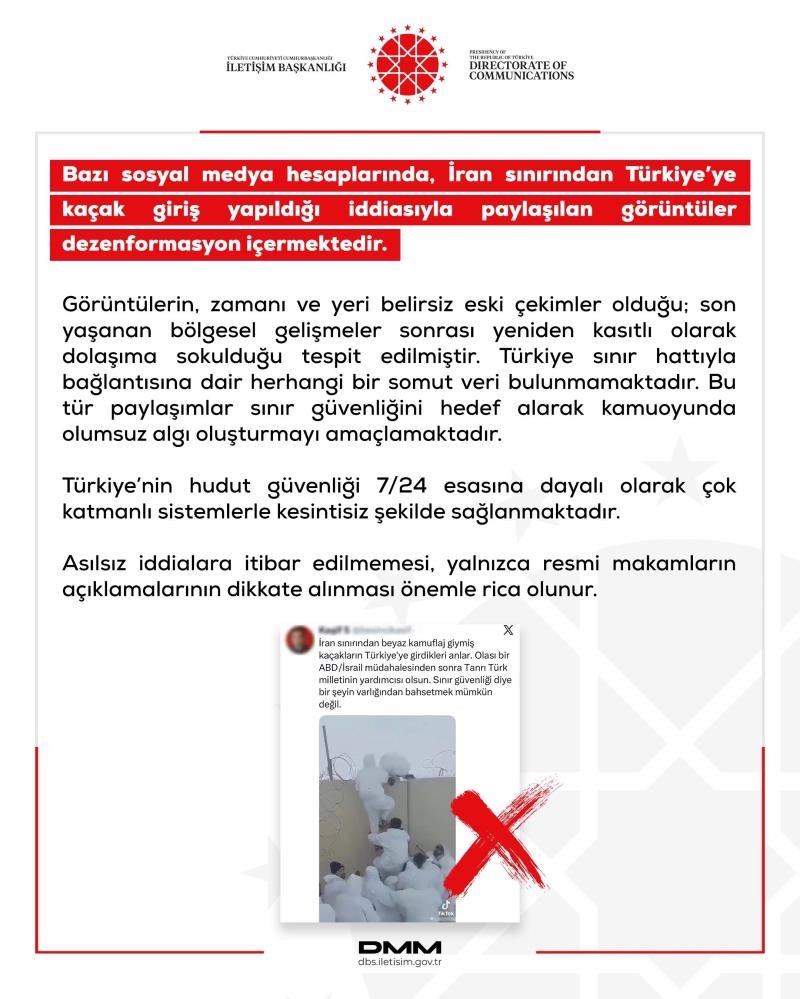 "Bazı sosyal medya hesaplarında İran sınırından Türkiye'ye kaçak giriş yapıldığı iddiasıyla paylaşılan görüntüler, dezenformasyon içermektedir. Görüntülerin, zamanı ve yeri belirsiz eski çekimler olduğu, son yaşanan bölgesel gelişmeler sonrası yeniden kasıtlı olarak dolaşıma sokulduğu tespit edilmiştir. Türkiye sınır hattıyla bağlantısına dair herhangi bir somut veri bulunmamaktadır. Bu tür paylaşımlar, sınır güvenliğini hedef alarak kamuoyunda olumsuz algı oluşturmayı amaçlamaktadır. Türkiye'nin hudut güvenliği 7/24 esasına dayalı olarak çok katmanlı sistemlerle kesintisiz şekilde sağlanmaktadır.
