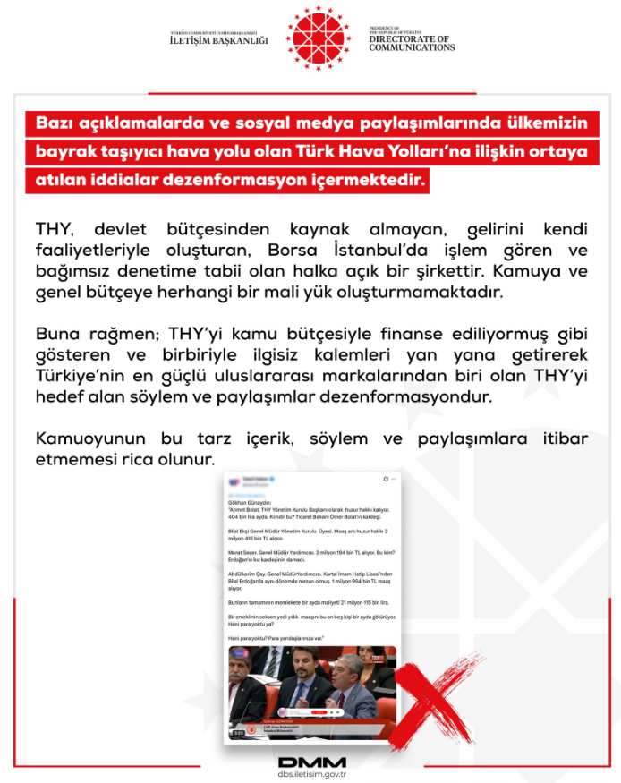 İletişim Başkanlığı Dezenformasyonla Mücadele Merkezi, sosyal medyada Türk Hava Yolları (THY) hakkında ortaya atılan iddiaların dezenformasyon içerdiğini açıkladı.