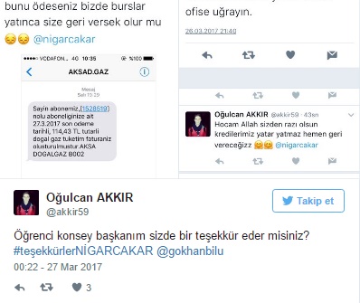 Teknoloji Fakültesi Bilgisayar Mühendisliği Bölümü 3. sınıf öğrencisi Oğulcan Akkır, sosyal paylaşım sitesi Twitter'daki hesabından Rektör Çakar'ın kişisel hesabına, doğal gaz faturasının fotoğrafını göndererek, "Sayın rektör hocam, biz de mağduruz. Bu seferlik borç olarak bunu ödeseniz, biz de burslar yatınca size geri versek olur mu?" mesajı attı.