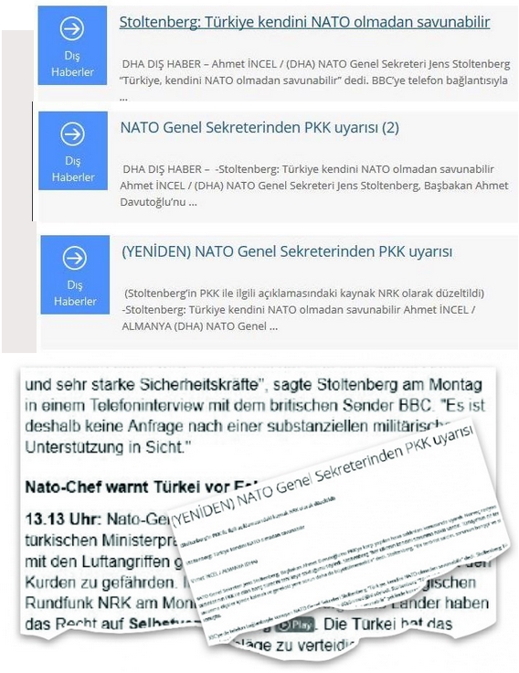 Saat: 15.27-İkinci haberden yaklaşık 2 buçuk saat sonra DHA, aynı metni abonelerine 3'üncü kez geçti. Fakat haberin durumu son versiyonda daha bir garipleşti. Haber iştahıyla 'gözünü karartan' DHA bu defa direkt “NATO Genel Sekreterinden PKK uyarısı" başlığını kullandı. Israrla servis edilen metnin son haline göre Stoltenberg, PKK uyarısına ilişkin demeci BBC'ye değil, Norveç radyosu NRK'ya vermişti. Stoltenberg'in PKK mesajını NRK'dan, IŞİD mesajını ise BBC'den duyurduğunu iddia eden DHA, aynı haberde kullandığı iki farklı kaynakla 'örgüt şantajını' belirsizleştirmeye çalıştı.