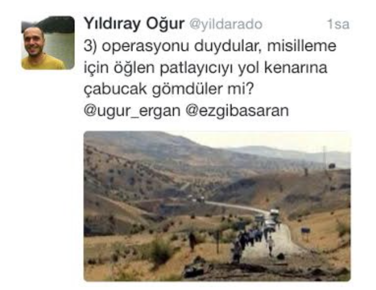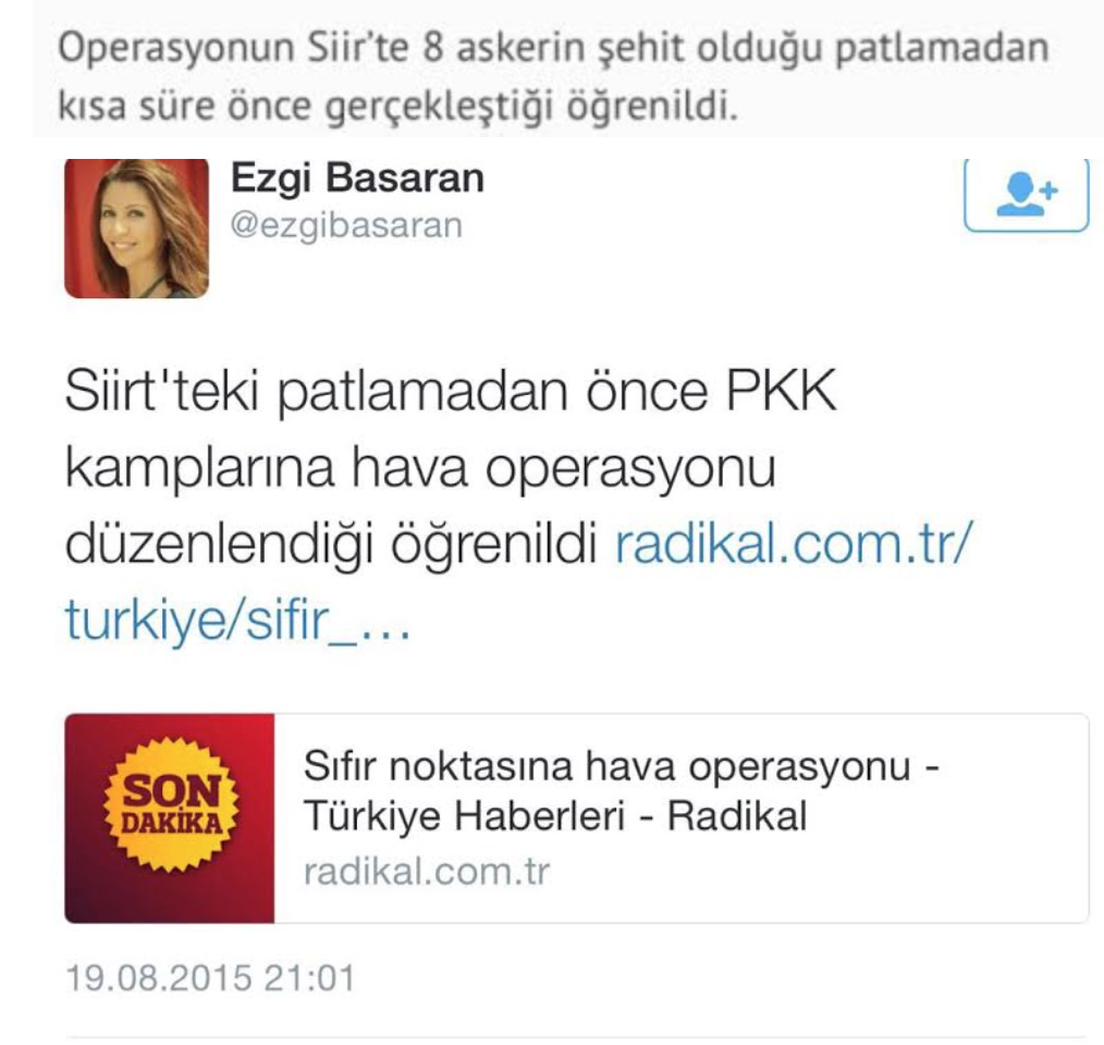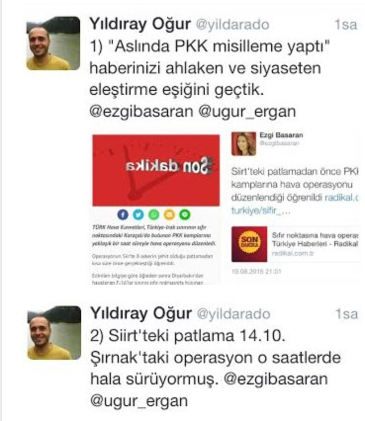 Radikal’den Ezgi Başaran’ın da “Siirt’teki patlamadan önce PKK kamplarına hava operasyonu düzenlendiği öğrenildi” ifadeleriyle haberi paylaştığı tweet’e, Türkiye Gazetesi yazarı Yıldıray Oğur, net tespitlerle tepki gösterdi: