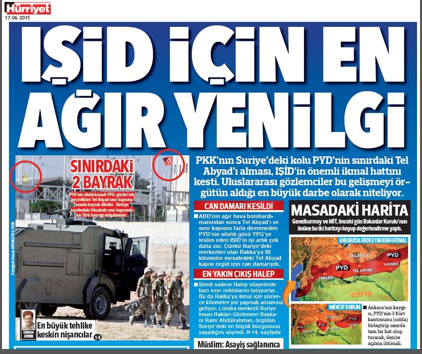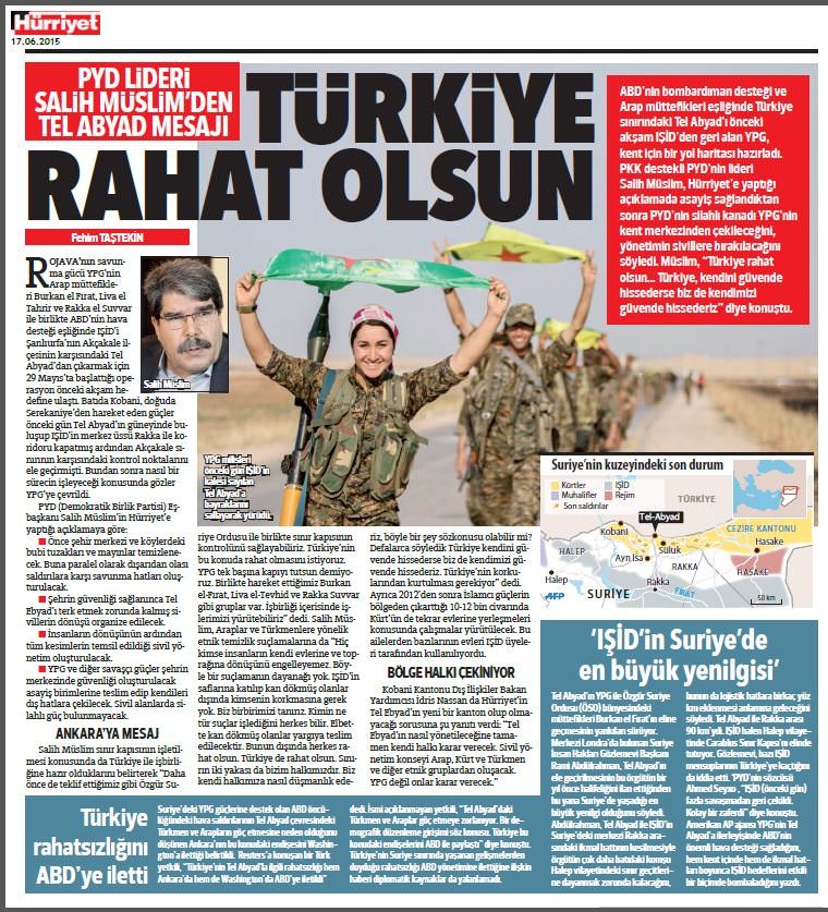 PYD, Tel Abyad’ı IŞİD’ten alırken, Özgür Suriye Ordusunun bazı birliklerinin de yoğun desteği vardı. Ancak sınıra çekilen PYD bayraklarının ardından Özgür Suriye Ordusunun tüm üyeleri Tel Abyad’ın dışında, Halep-Rakka sınırındaki bir bölgeye çıkarıldı.