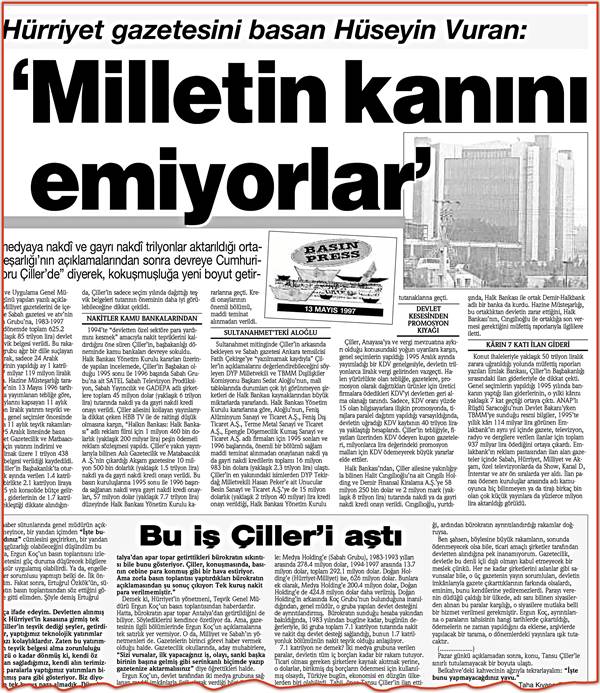 14 Mayıs 1997 tarihli Akit Gazetesinde yer alan ‘Milletin kanını emiyorlar’ başlıklı haberde ise Hürriyet Gazetesi’ne yönelik saldırı ve teşvik skandalı şöyle anlatılıyor: “İkitelli’deki “Medya Towers’ını tek başına basan Hüseyin Vuran “Bunların milletin kanını emdiğine karar verdim” diyerek eyleminin gerekçesini açıklamasının ardından “Teşvik Kredileri” adı altında kartel medyasına dağıtılan hazine imkanları yeni boyutlar kazandı. DYP lideri Çiller’in istemi üzerine, Hazine Müsteşarlığı Teşvik ve Uygulama Genel Müdürlüğü’nce pazar günü yapılan yazılı açıklamada, Hürriyet ve Milliyet gazetelerini de içeren Doğan Grubu ile Sabah gazetesi ve atv’nin de sahibi olan Bilgin Grubu’na, 1983-1997 arasındaki 14 yıllık dönemde toplam 625.2 milyon dolarlık (yaklaşık 85 trilyon lira) devlet desteği sağlandı, teşvik belgesi verildi.